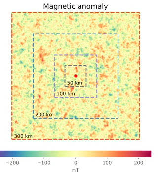 The magnetic anomaly is the observed magnetic field less the contribution from the core and external fields. Geologic features enhance or depress the local magnetic field; this response is primarily controlled by the concentration of magnetite in the Earth’s crust. Magnetite is the most prevalent magnetic mineral, in terms of both its magnetic susceptibility and concentration in the crust, and has a Curie point of 580°C. The depth at which rocks lose their permanent magnetic properties is referred to as the Curie depth. Due to the prevalence of magnetite in the crust, the Curie depth is often interpreted as the 580°C isotherm. Current methods to derive the Curie depth first compute the (fast) Fourier transform over a square window of a magnetic anomaly that has been reduced to the pole. The depth and thickness of magnetic sources is estimated from the slope of the radial power spectrum.