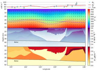 Model with the optimal tradeoff between Curie depth, heat flow data and a priori estimates of thermal conductivity and rates of heat production.Modelling temperature in the Earth’s crust is accomplished by populating a geological model with thermal properties, such as thermal conductivity and rates of heat production, and solving a numerical model of thermal diffusion with assigned boundary conditions. The desired temperature solution is often the one that best matches our observations – e.g. temperature in a well – but strong assumptions are made of how thermal properties vary with depth, which result in simple first-order predictions of the temperature field.