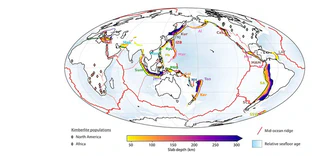 This study uses machine learning to identify the key tectonic factors that control kimberlite eruptions across the globe. The results show that the volume of oceanic plate being pushed down into the Earth’s interior at subduction zones — a quantity called slab flux — is strongly correlated with when and where kimberlites erupt. When more oceanic plate is being subducted, kimberlite eruptions become more frequent, even in the deep interiors of continents thousands of kilometres from the nearest subduction zone.