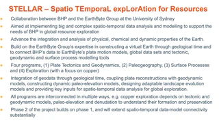 Collaboration between BHP and the EarthByte Group at the University of Sydney Aimed at implementing big and complex spatio -temporal data analysis and modelling to support the needs of BHP in global resource exploration Advance the integration and analysis of physical, chemical and dynamic properties of the Earth. Build on the EarthByte Group’s expertise in constructing a virtual Earth through geological time and to connect BHP’s data to EarthByte’s plate motion models, global data sets and tectonic, geodynamic and surface process modelling tools Four programs, (1) Plate Tectonics and Geodynamics, (2) Paleogeography, (3) Surface Processes and (4) Exploration (with a focus on copper) Integration of geodata through geological time, coupling plate reconstructions with geodynamic models, constructing dynamic paleo-elevation models, designing adaptable landscape evolution models and providing key inputs for spatio -temporal data analysis for global exploration. All programs are interconnected in multiple ways, e.g. copper exploration depends on tectonic and geodynamic models, paleo-elevation and denudation to understand their formation and preservation Phase 2 of the project builds on phase 1, and will extend spatio -temporal data-model connectivity substantially Full plate reconstructions from 1 Ga to present Phase 1 objectives: GPlates training for BHP team – completed (and ongoing) Kinematic testing and improvements of 1 Ga plate motion model – completed Improved useability of model (e.g., turn deformation on/off) Implementation of new Tethyan model – underway Standardisation of Plate IDs and absolute reference frame back to 1 Ga – on track Improvements to flat slab geometries – on track Geodynamic model run – depending on RA onboarding timeframe Integration: Plate models and geodynamic outputs will be used by other STELLAR programs Collaboration with BHP: Key regions already identified (e.g., Urals, Tethys, and east Asia in Phase 1. GoM , Zechstein Basin, and others next year) + some key data already discussed. Personnel: Sabin Zahirovic (Lecturer, ARC DECRA Fellow) Roberta Carluccio (STELLAR Research Associate) Youseph Ibrahim (STELLAR research assistant) Chris Alfonso (STELLAR research assistant) Sydney Informatics Hub support (TBA) Satyam Pratap Singh (STELLAR PhD student joint with Program 2*) * accepted into USyd PhD program but awaiting confirmation of PREA scholarship. Paleogeography Phase 1 objectives: Paleobathymetry grids (and workflows) using our traditional method (incl. oceanic basement depth, sediment thickness, LIPs and their conjugates, passive margins) – 0-250 Ma Enhanced paleobathymetry grids (and workflows) which merges our traditional workflow (but additionally incorporates the reconstruction of major seamount chains) with reconstructed present day bathymetry - 0-250 Ma Broad-based paleo-topography maps (and workflows), which includes paleo-geographies, dynamic topography, tectonic topography for rifts and passive margins and a…
